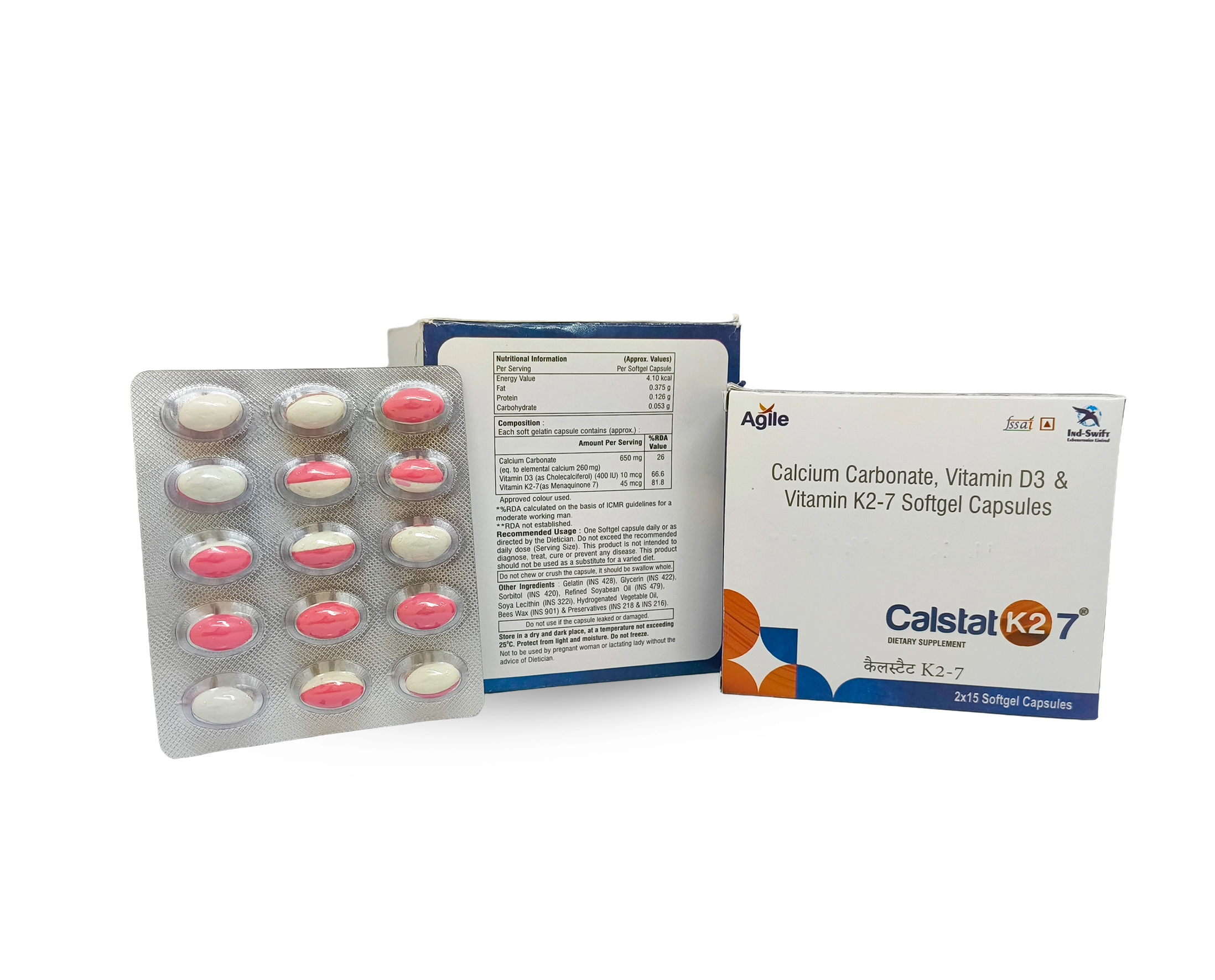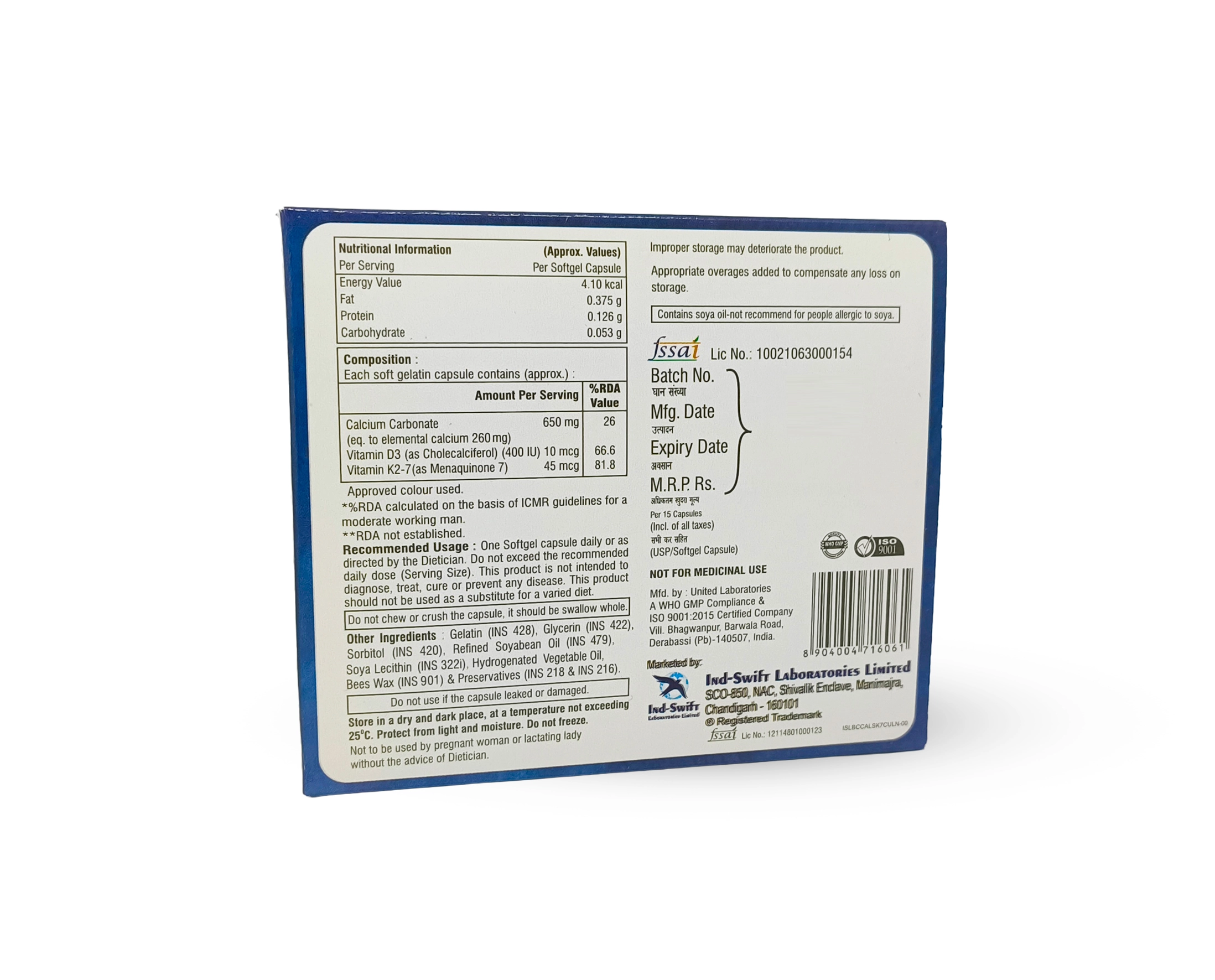 Each soft gelatin capsule contains – Calcium Carbonate 1250mg (Eq. to elemental calcium 500mg) + Calcitriol 0.25mcg + Vitamin K2-7 45mcg